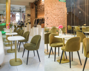 L’intérieur s’articule autour de notre chaise Émile, véritable pièce maîtresse du lieu. Revêtue de velours Monolith Olive 38, elle s’associe avec élégance à la table Circa finition laiton, apportant caractère et raffinement à l’ensemble. Pour sublimer cet espace, le décor de plateau effet marbre blanc “HP98 Carrara Creamy” vient renforcer l’esprit luxe et contemporain du restaurant, tout en offrant une esthétique à la fois intemporelle et moderne.
